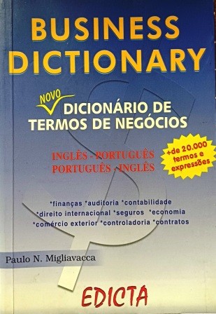 Business Dictionary – Novo Dicionário de Termos de Negócios: Inglês – Português /Português -Inglês. Uma ferramenta valiosa para estudantes, profissionais de administração, economia ou qualquer pessoa que trabalhe com negócios e precise de um recurso confiável para terminologia internacional. A obra ainda possui tabelas de conversão de moedas, exemplos de demonstrações financeiras e de pesos e medidas.